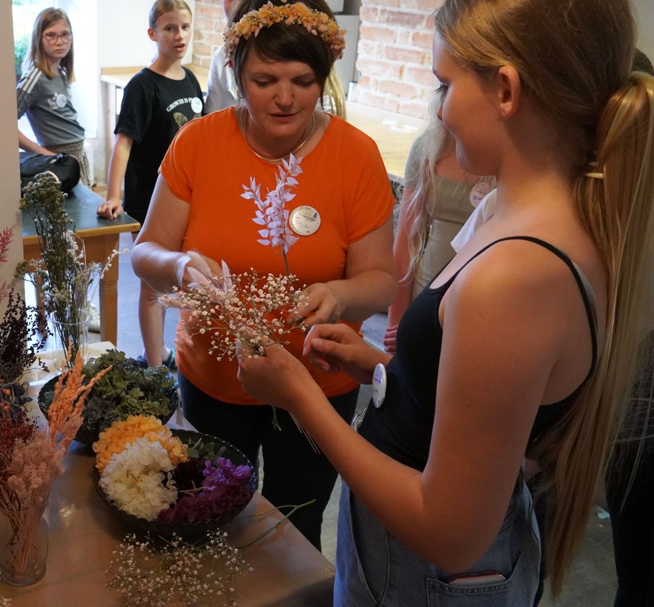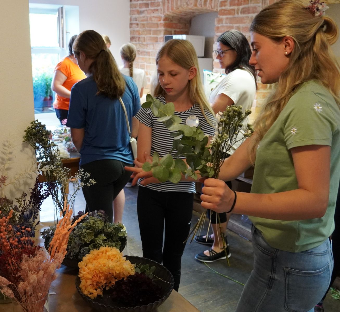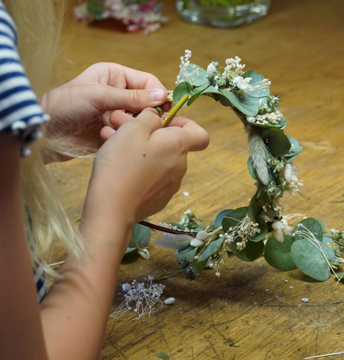 🌼 Die RegioKinderCampus- Kids wählten schließlich frische Blumen oder Trockenblumen, farblich passend zur Volksfest- Garderobe. 😀Hortensie, Eukalyptus, u.ä. kamen zum Einsatz. Da waren alle fröhlich und eifrig bei der Sache und Tanja Obermeier musste manchmal ein wenig bremsen.. „Ihr werd’s z‘ dick!!“ 🤣 .. dass sie damit die Kränzchen gemeint hat und nicht die Kinder, das wollen wir ihr mal glauben 😇😉 und kommen gerne wieder! 💐